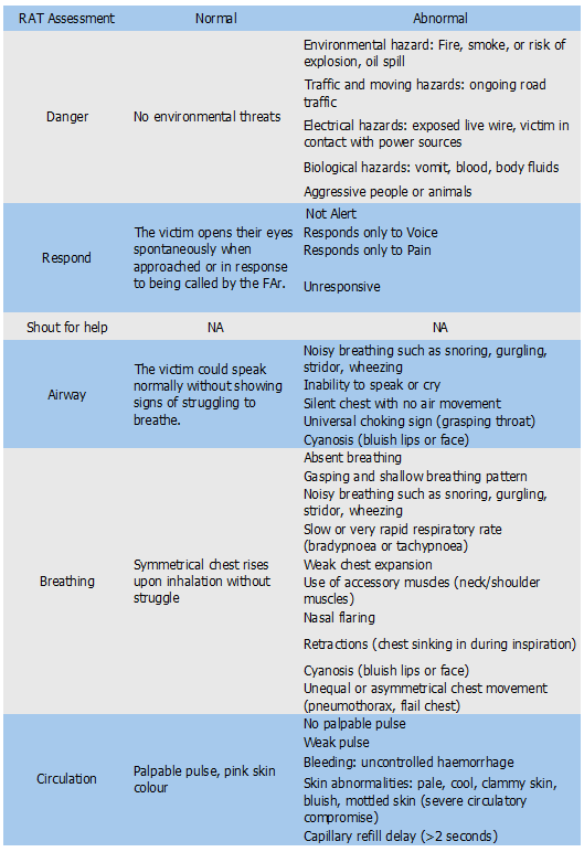 First Aid Rapid Assessment Techniques (RAT) consist of two key components: the systematic and standardised sequence outlined by the European Resuscitation Council (ERC) known as DRSABC (Danger, Response, Shout for help, Airway, Breathing, Circulation), and the quick assessment of a victim’s level of consciousness using the AVPU mnemonic (Alert, Verbal, Pain, Unresponsive). To make it practical and easy for the layperson to follow, the RAT begins with identifying the potential risk from the environment and the victim, followed by determining the level of consciousness, calling for assistance, and managing the airway, breathing, and circulation to address both types of conditions.