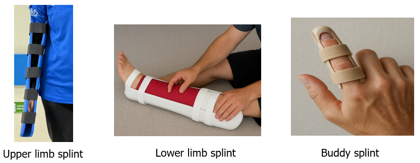 Splinting refers to the application of a rigid or semi-rigid support, called a splint, to stabilise an injured bone or joint. This procedure is performed to immobilise the affected area, minimise pain, prevent further damage to blood vessels, nerves, or muscles, and make transportation of the casualty safer. Splints can be improvised using materials such as wood, cardboard, rolled-up magazines, or commercial plastic, metal, or inflatable materials. They should immobilise the joints above and below the fracture site whenever possible.