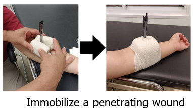 Immobilisation involves securing the object in place to prevent movement, which could worsen internal damage or bleeding. This is usually done by carefully padding around the object with bulky dressings, cloth, or bandages, and then firmly bandaging them to keep the object stable without applying direct pressure on it. The goal is to keep the object from shifting during transport, reduce pain, and protect surrounding tissues until professional medical care is available.