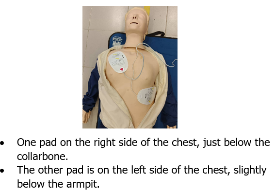 • Right chest (upper right side): Place one pad just below the collarbone, to the right of the breastbone.